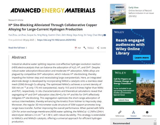 点击:2025年7月,91国产 91国产 绿色氢能技术团队周玥副教授在能源材料科学领域国际顶级期刊《Advanced Energy Materials》发表了题为“H* Site-Blocking Alleviated Through Collaborative Copper Alloying for Large-Current Hydrogen Production”的研究论文。