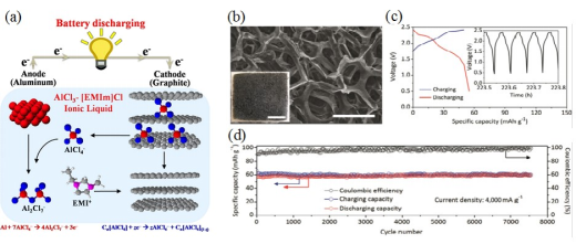 图 1 铝离子电池工作原理示意图及电池性能分析
